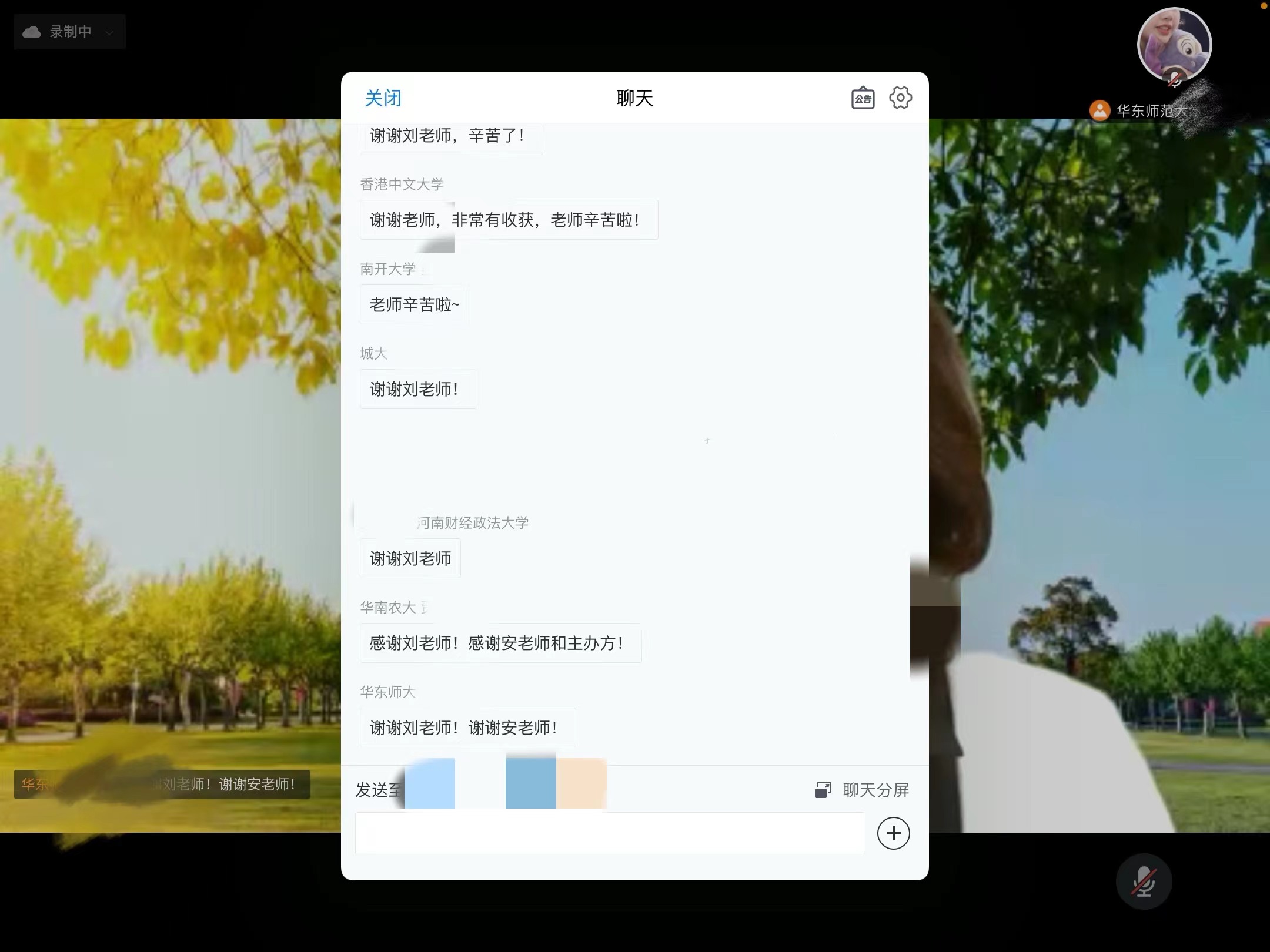 讲座尾声,来自全国各地不同高校的师生、相关领域工作人员,积极地在留言区向刘惠老师分享自己的想法。刘老师就留言区的相关问题给予了详细解答。讲座最后,安秋玲老师再次向刘老师表达感谢,参会师生也纷纷在留言区表达谢意。至此,本场讲座圆满落幕!