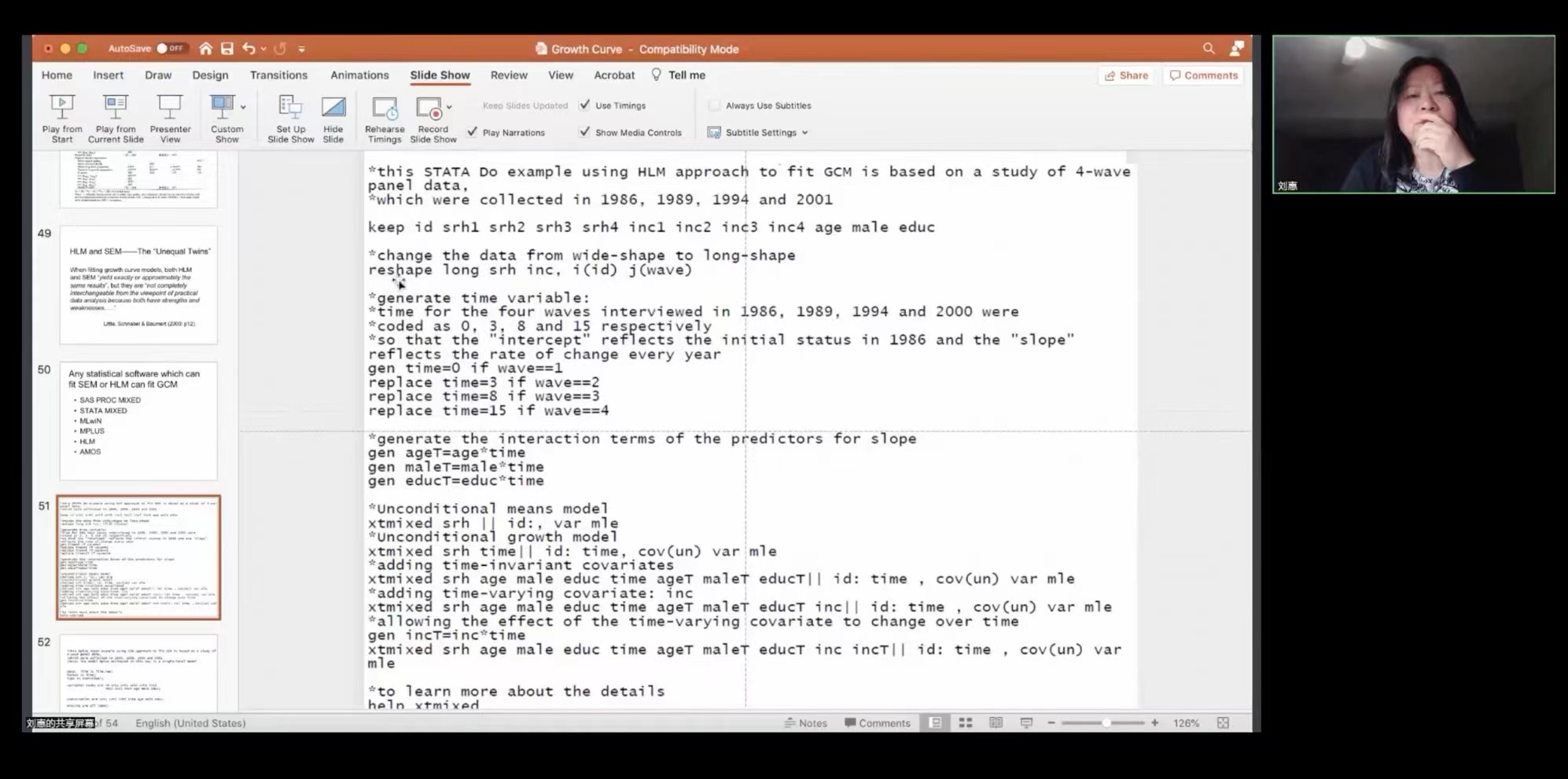 在第四部分,刘惠老师对HLM和SEM做了比较。刘慧老师表示,用HLM或者用SEM拟合增长曲线模型的时候,结论基本会大同小异,但也并不是说能够完全互换。接着刘老师用具体的案例为大家呈现了用HLM和SEM方法做出来的结果优缺点,并告诉大家采取哪个方法需要具体问题具体分析。然后,老师为大家呈现了能够做SEM或HLM的常用统计学软件,并表示目前用的最多的是Mplus。最后,老师给大家展示了用stata做HLM的代码以及Mplus的代码,并为大家推荐了一些相关的阅读材料。
