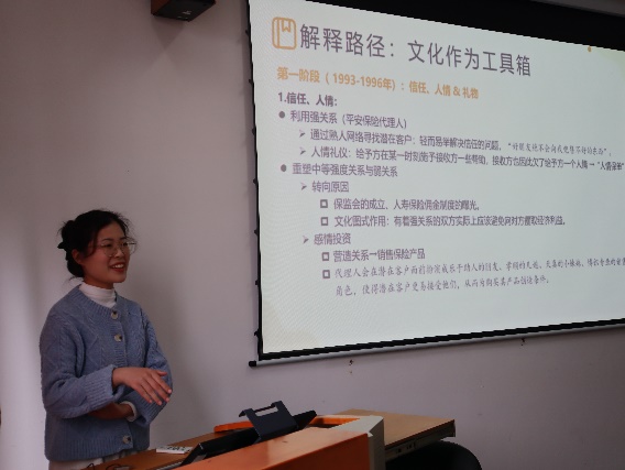 分享环节中,施卫淑同学从自身兴趣点出发,梳理了本书采用的研究方法——访谈。通过学习本书从历史角度出发进行研究的方式,结合自身课题经历,她认为启在课程论文上应该从一个脉络着力。其次,本书中关于保险公司的国内外背景给她启发,选择研究对象时需要考虑文化背景。