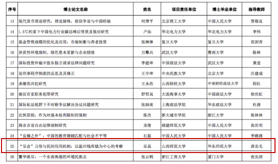 民俗学研究所唐忠毛教授指导的2016级博士研究生乐晶获得优秀博士论文出版项目,题目为《“呈会”习俗与民间信用机制:以温州钱库镇为中心的考察》。据悉,2022年度国家社科基金优秀博士论文出版项目共批准立项69项,其中社会学3项。