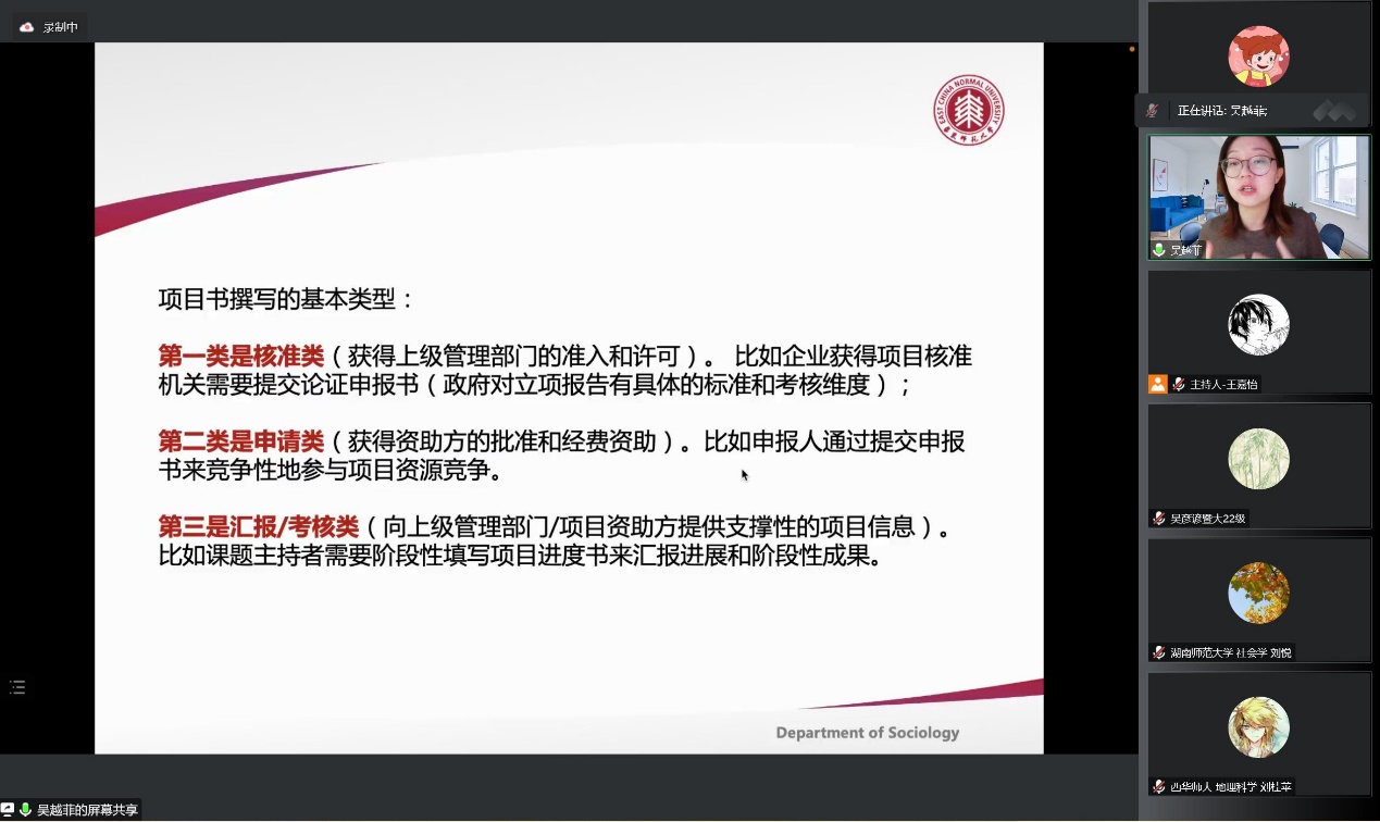 之后吴老师讲解了项目制背景下项目书的撰写。基于三种课题申报类型和三种项目书撰写的基本类型,说明撰写时的要求与目的,如申请类需要新颖、重要、合理;汇报类需要良好进度和可见成果等。吴老师又以木瓜视频