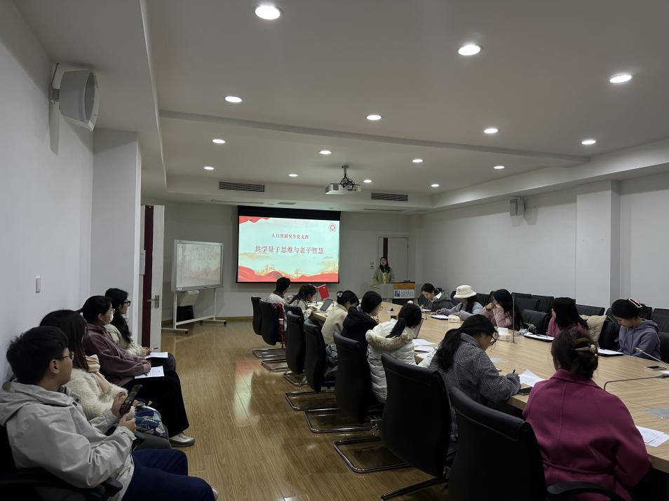 人口所硕士研究生党支部立足前期对学生的摸底情况,以破除学生党员对量子思维与老子智慧“玄之又玄”的畏惧迷思,举办了一场别开生面的理论学习课堂,共学量子思维与老子智慧。人口所硕士研究生党支部书记金雪玲通过“琳达的小测试”和现实生活中的小例子来阐释基于直觉性的合取谬误正是类量子的思维模式,进而展开了对量子世界观的探讨。