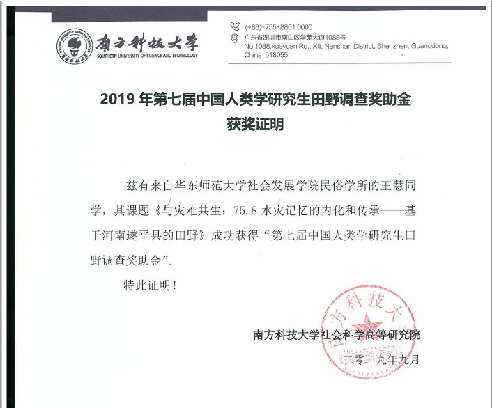 “中国人类学博士论文田野奖助金”由重庆大学人类学研究中心率先于2013年设立,自2017年起改由南方科技大学社会科学高等研究院主办,面向海内外公开公平遴选,旨在鼓励年青学者从事富有深度的专题性田野调查,增强专业方法训练,着眼学术前沿问题,促进理论与方法创新。这是民俗学研究所研究生第二次获奖,2015级博士研究生雷天来的课题《灾后社会日常生活实践与公共空间型塑——以北川新县城移民社区为例》曾获得2017年第五届“中国人类学研究生田野调查奖助金”资助。