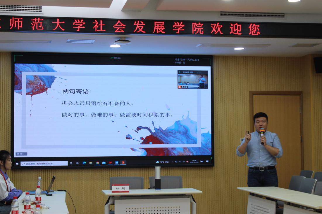 随后,社会学系2007级本科、2011级硕士校友,现任中国供销粮油公司综合部副部长徐超进行发言。徐超学长从大学、职场、未来三个方面进行了分享,并鼓励大家要打下扎实的专业基础,多与老师交流,多交朋友,确定合适的求职目标,形成科学的时间规划。之后学长结合自身经历,建议大家理性求职,注重平台、岗位、信息、氛围,进入职场后要不断地学习,保持谦虚的态度、稳定的心态、合作的意识,并且注重细节的把控。最后学长以两句寄语勉励大家,“机会永远只留给有准备的人”,“做对的事、做难的事、做需要时间积累的事”。