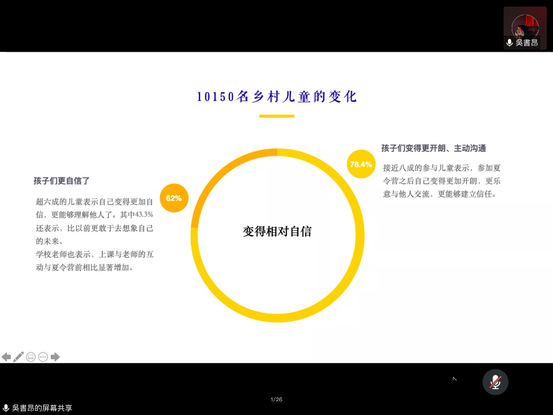 随后,来自香港中文大学深圳校区的杨笑逐同学为我们带来了关于支教形式创新的分享。在支教中,团队用观察的方式发现孩子们在教育中的痛点,进行有针对性的、趣味性的引导与开发,并结合互联网的方式,利用视频通话与线上课堂与孩子们保持长期联系,进一步优化与巩固支教的成果。