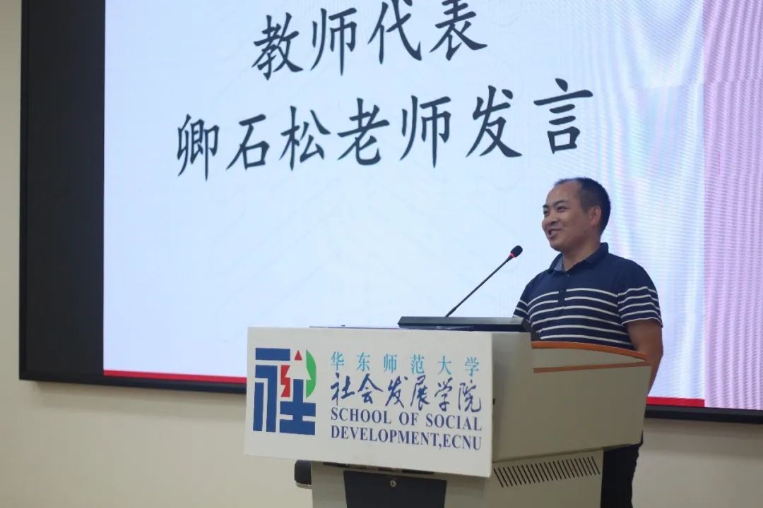 教师代表卿石松发言,他以风趣幽默的言语欢迎同学们的到来,并以自身的求学经历来勉励新生们要学会规划、丰富生活,把握美好大学时光。