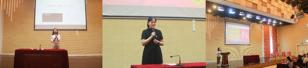 优秀的学生党员用他们的思想与行动书写了自己的青春风采。在本次“先锋说”讲坛上,“感动师大·青年学子”优秀防疫志愿者、社会学硕士研究生党支部的杨澜同学分享了她对青年学生参与社会实践活动的看法。杨澜同学从家乡出发,介绍了她参与开封市非物质文化遗产发展、调研家乡养老机构,以及在疫情期间用文字和图片记录家乡抗击疫情的故事。她用步子扎根田野,用知识发展家乡,用热情奉献社会,并且呼吁学生党员们积极参加社会实践,展现青年担当。人口所研究生党支部的王路遥同志分享了她将学习“学习强国”发展为一种习惯的过程。她由最开始的被动学习,转变为自主鼓励、监督学习,直到将这一学习活动发展为一种习惯。关注时事热点、听读经典著作、练习英语阅读、提升思想觉悟,这些都是学习强国带给她的收获,她也鼓励大家一起参与到这一学习过程中来。社会学博士研究生党支部的杨洋同志进行了以“时间管理”为主题的学习经验分享。在学习“学习强国”的过程中,杨洋同志一方面合理整合碎片时间,在早间清晨收听新闻联播,在文献阅读的过程中交叉学习党建知识,并且利用其他碎片时间进行答题实践。另一方面,在疫情期间,杨洋同志努力追求对日常秩序的恢复,安排日常任务,培养自律意识,在充实的生活中寻找充实感与归属感。