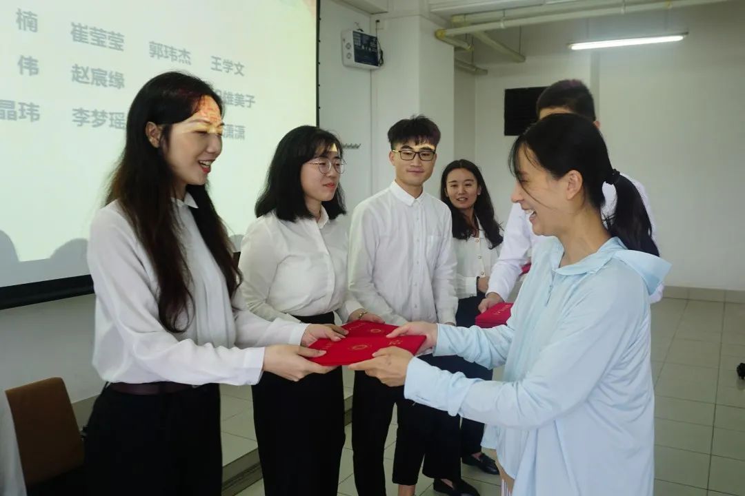 团委书记张睿老师为上一学年中工作认真负责、能力突出,获评“先进个人”的同学们颁发证书。