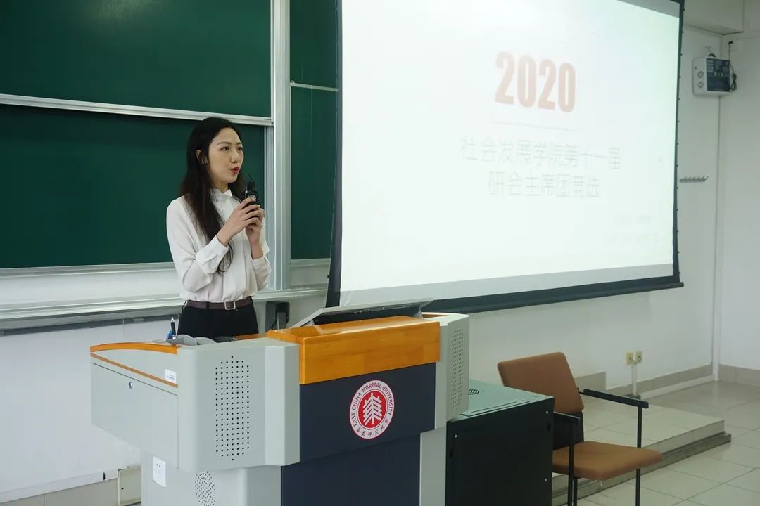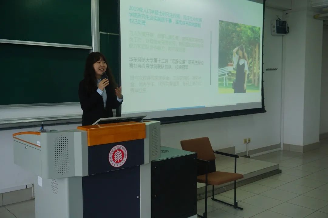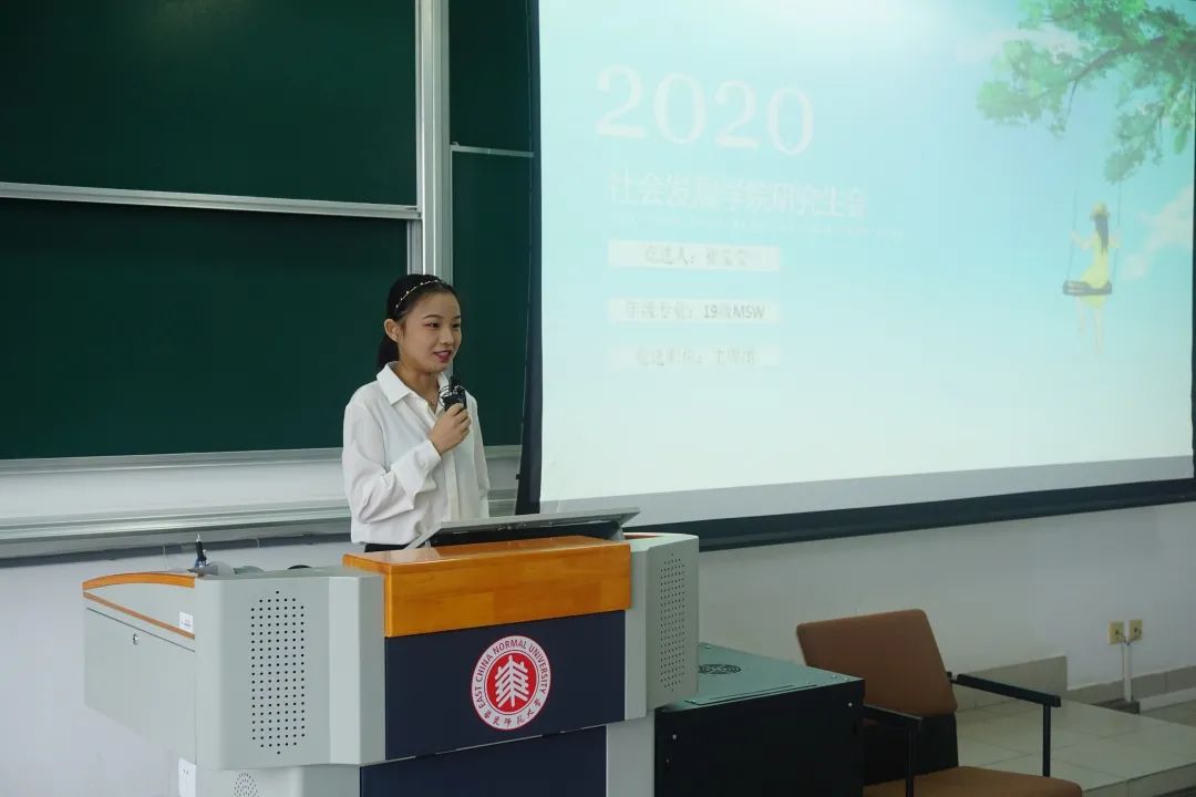 副院长兼党委副书记黄燕老师致辞,她先是对2020级新生们的到来表示热烈的欢迎,之后从以下四个方面提出研会发展的方向:提升研会品牌活动的影响力、加大研会与本科生和博士生的联系、做好学生和学院的桥梁、推行“引进来、走出去”的工作战略,最后预祝本次会议圆满结束。