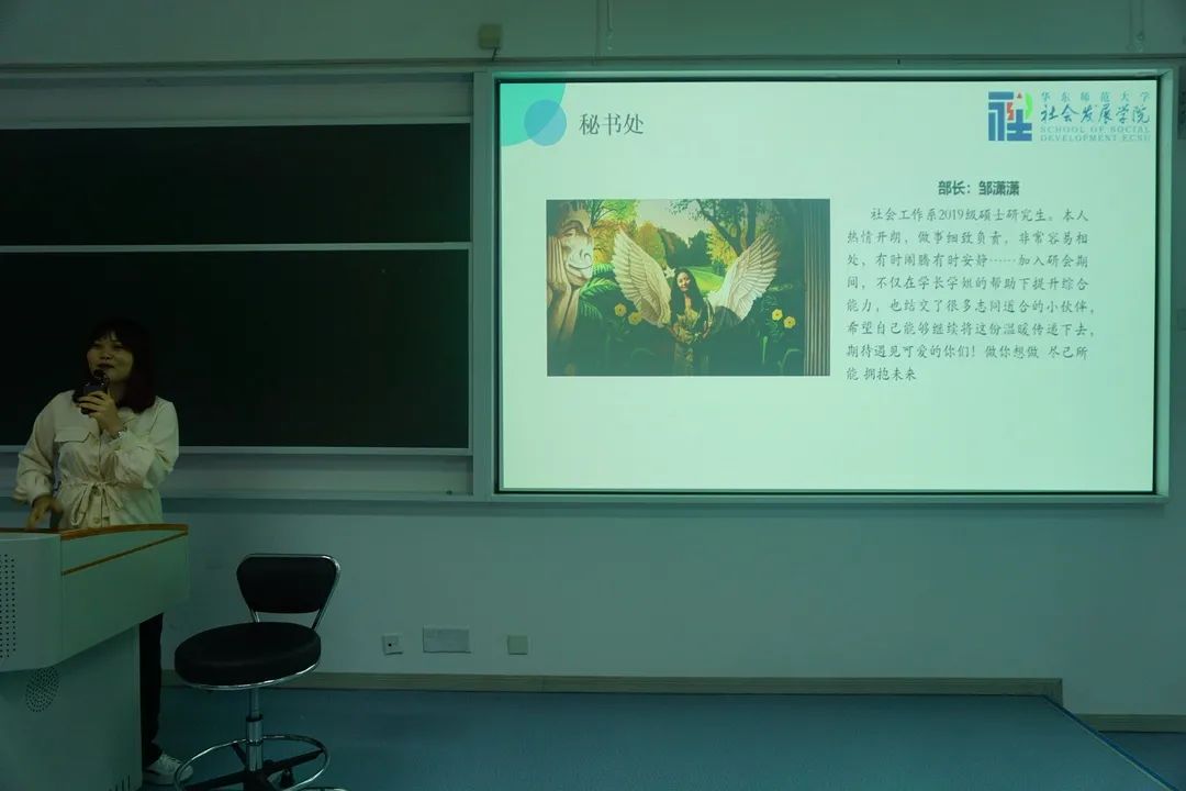 此外,各个部长还介绍了干事能够学习到的技能、积攒的经验,严肃中不乏幽默的打趣,表达了对干事工作能力和态度的期待。这极大地激发了在场新生的热情,让新生们感受到,社发研究生会是个其乐融融的大家庭。